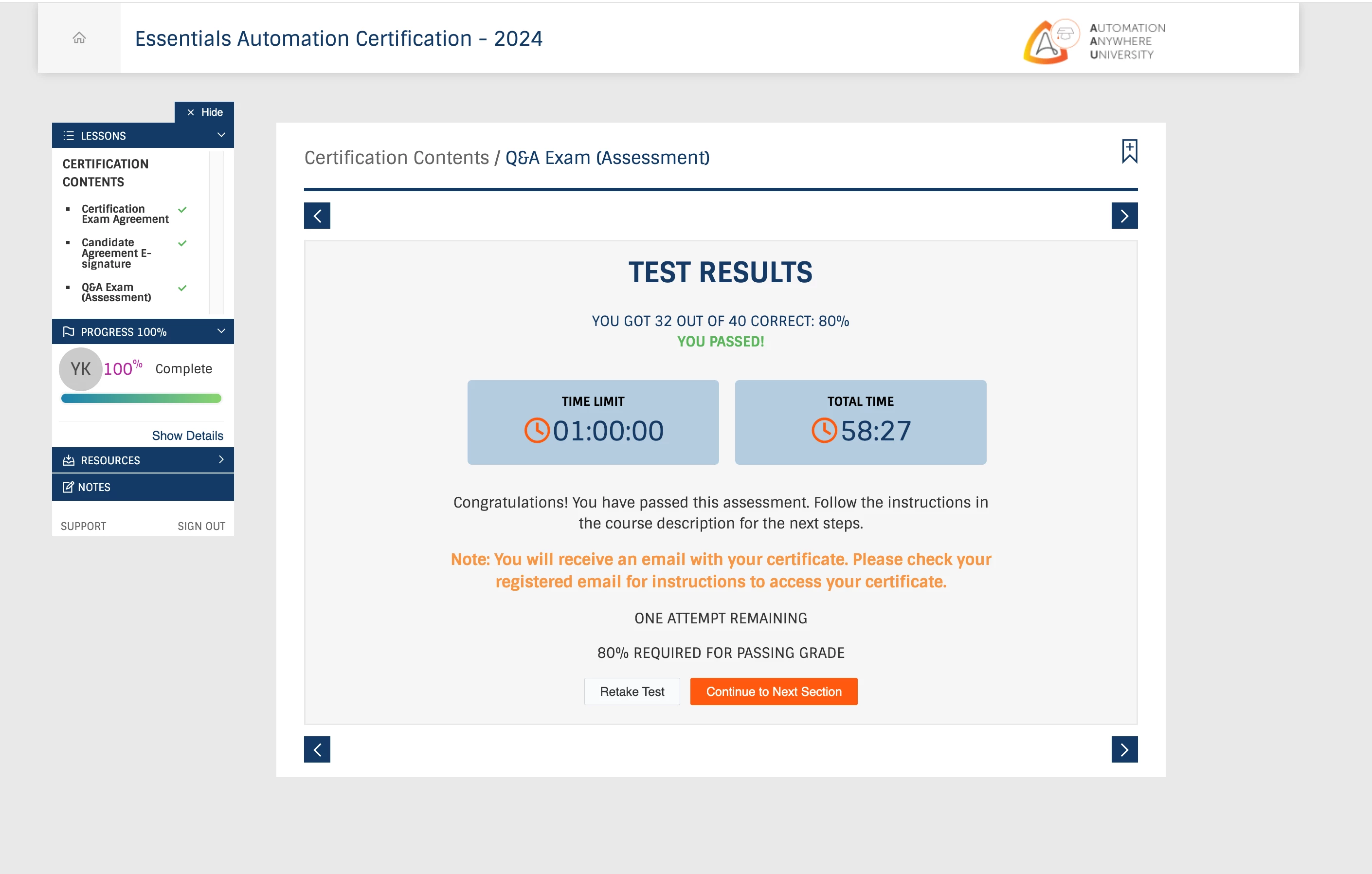This Sunday, January 26th, from 20:00 to 21:00 CET I passed the test 'Essential Automation Certification 2024'. Please see the attached screenshot. However, I have not received any emails since that time. Could you please re-send me the email?