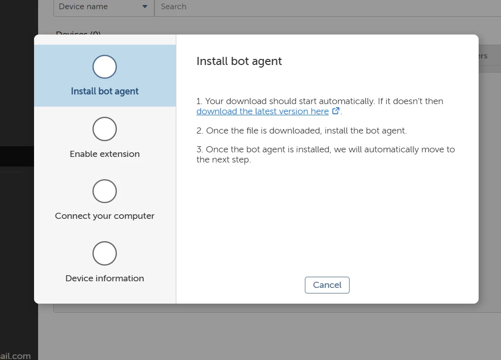I have tried downloading the Bot agent manually and enabled the A360 extension also but still I am unable to connect my local device. It does not move forward to next step even though if the bot agent is already installed. I have tried with different browsers also but still the issue remains the same.Bot agent already installed proofconnecting to local machine