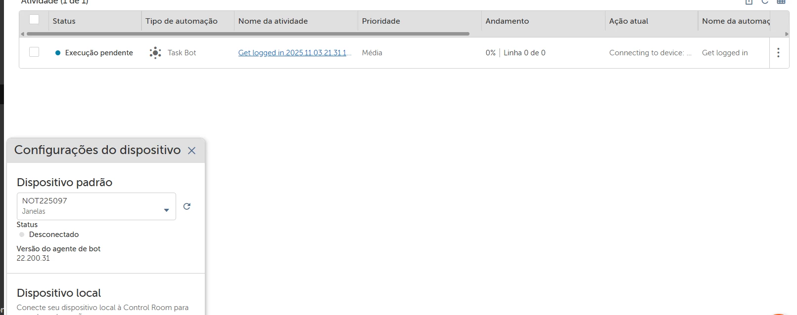 Estou com um problema no Automation Anywhere Community, no qual a meu bot ficou travado no status “Execução pendente” em um dispositivo que eu não tenho mais acesso.
