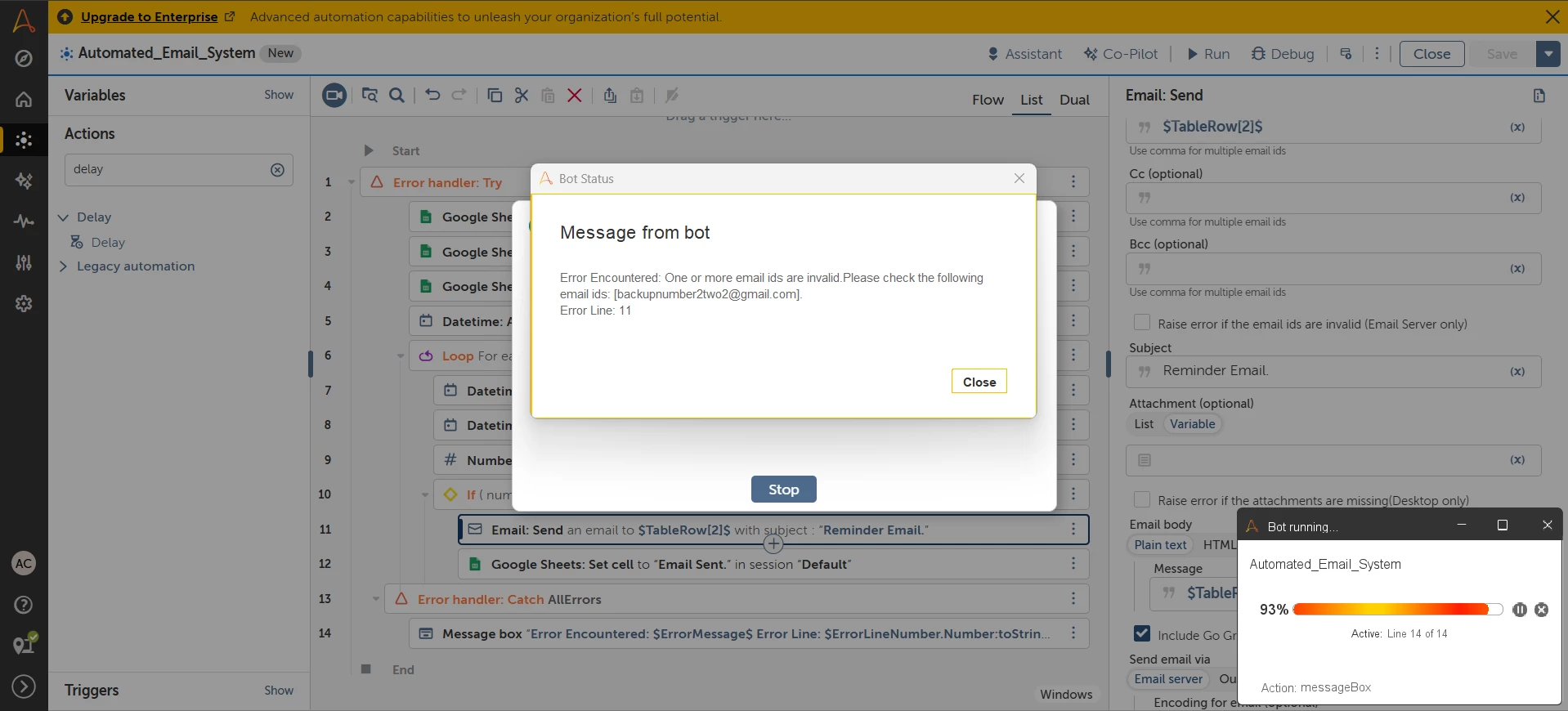 Your settings look okay. I don’t think we’re having a communication problem between the Bot Agent and Gmail due to the fact that you got an error message regarding the email address. That’s good.