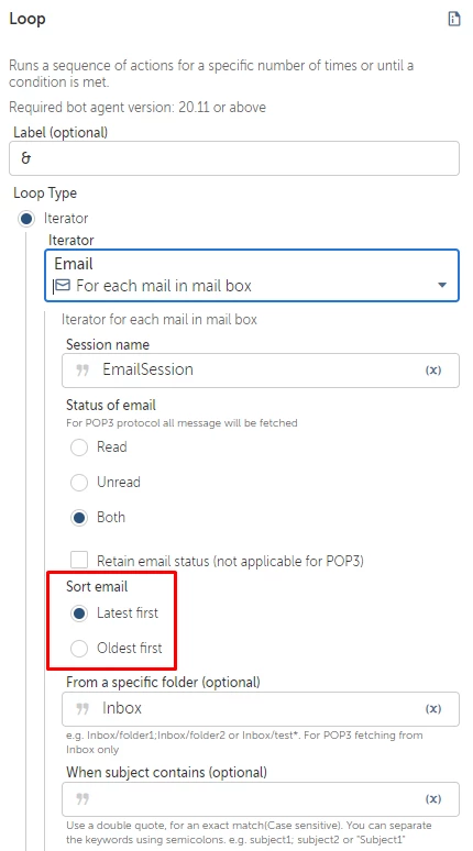 When using the loop through unread email action for specific subject name if multiple unread email are with same subject name exists during execution does it take the oldes unread mail for that subject