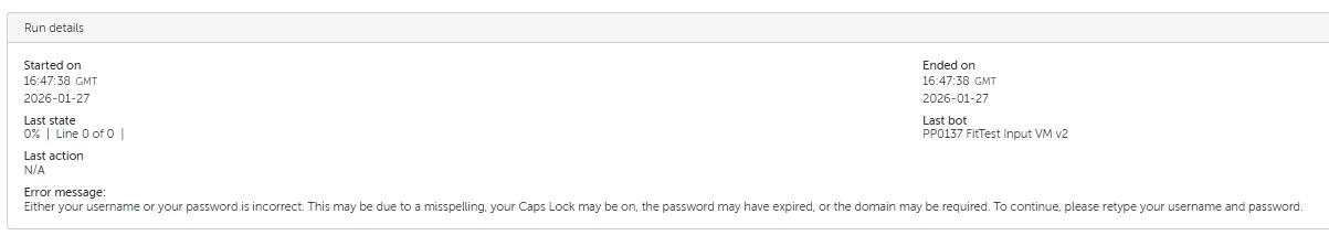 However, I now have a new issue where unattended bots loose connection to the virtual machine. The unattended bot ran as scheduled correctly, but when a subsequent scheduled bot tried to connect to the same virtual machine using the same credentials, it is unable to log in, and the virtual machine locks the account. The log in credentials have been unchanged and are correct, as the first scheduled bot logged in with no issue.