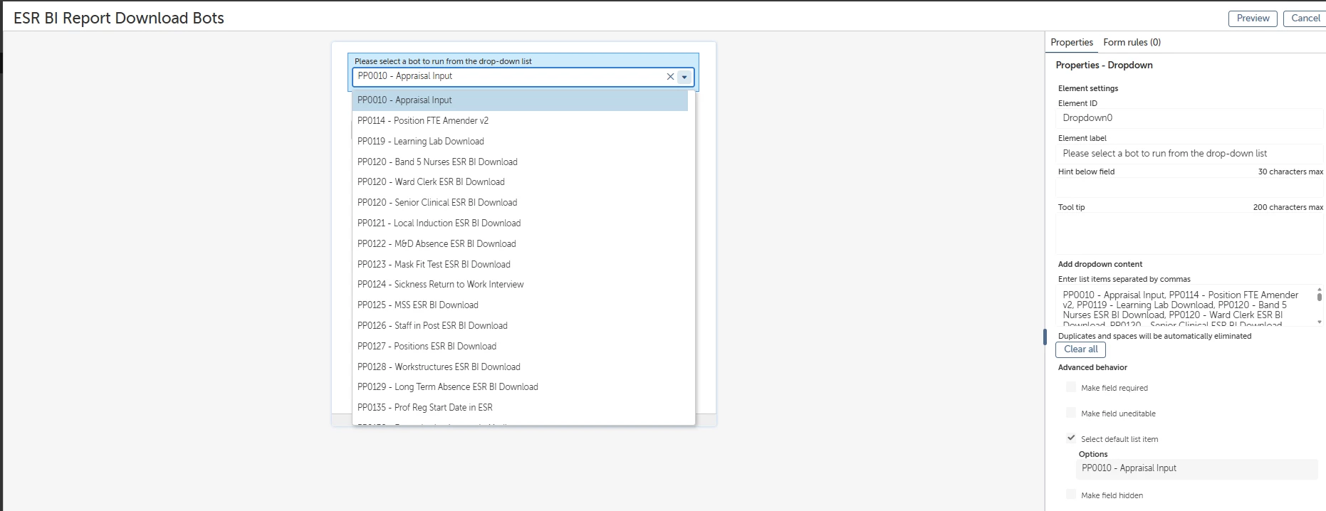 I have a form in AARI Co-Pilot that initiates a bot when selected from a drop-down list. This has been working well for a number of months. However, after I added a new item to the drop-down list today, the form is no longer working. The drop-down list does not appear, and instead I see a greyed out text box. Does anyone have any ideas why this might have happened?