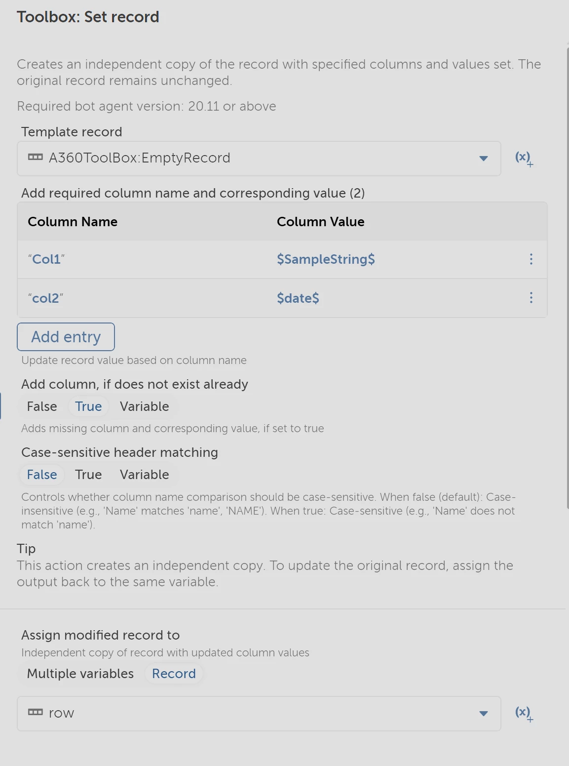 Unfortunately, working with record objects in AA is anything but elegant. Here is a simple example which you should be able to modify to your needs. First I create an empty record with the headers I need: