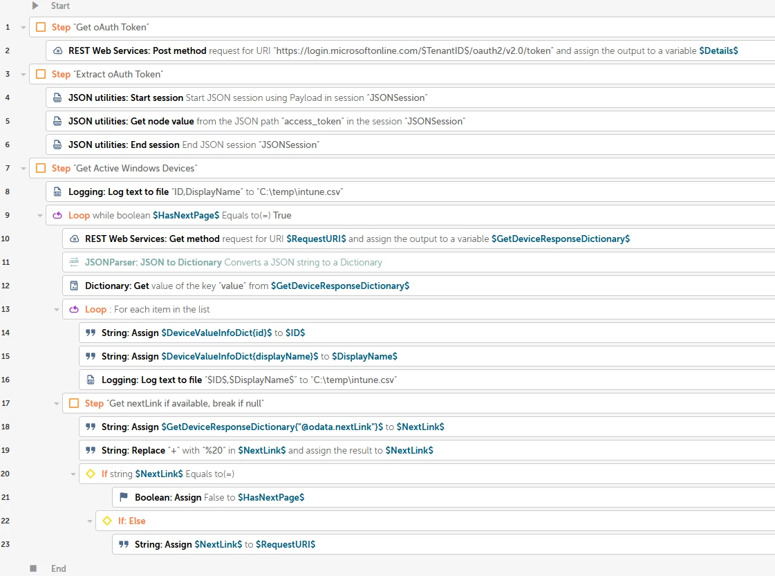 I’m brand new to Automation Anywhere and using the Community Edition. To help me get to know my way around, I wanted to see if I could pull data from MSGraph. I basically felt my way through this one in the dark and I’m proud to say that it’s a working flow, with pagination, and it seems efficient; however, I was wondering if there is a better way to do it (other than writing a script). It felt weird to convert from JSON to dictionary, from dictionary to list, and then have to use what seemed to be for logging to write the output to CSV, so my thought is I am likely not following best practice.