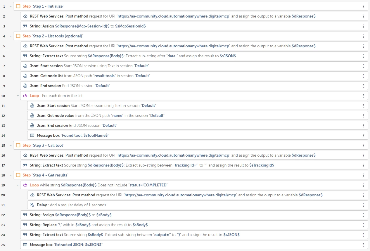 This shows usage of the four most common MCP functions. Step 2, list tools, may not be necessary unless you are unsure of what tools are available on the server.