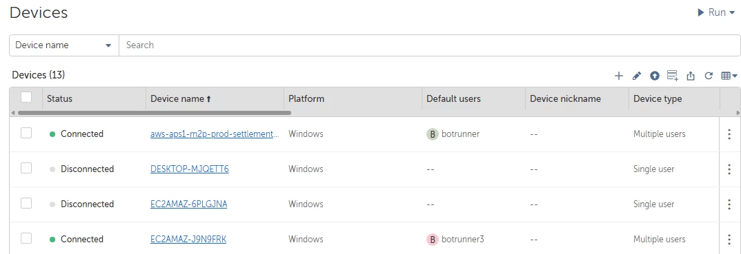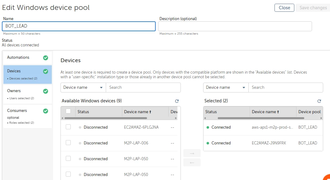 However, I'm facing an issue with the device pool. Whenever I try to run tasks using the device pool, it always selects the device associated with botrunner (machine 1). If I'm logged in using the botrunner account, the task status shows as "picked at run time," but it does not choose botrunner3 for execution.