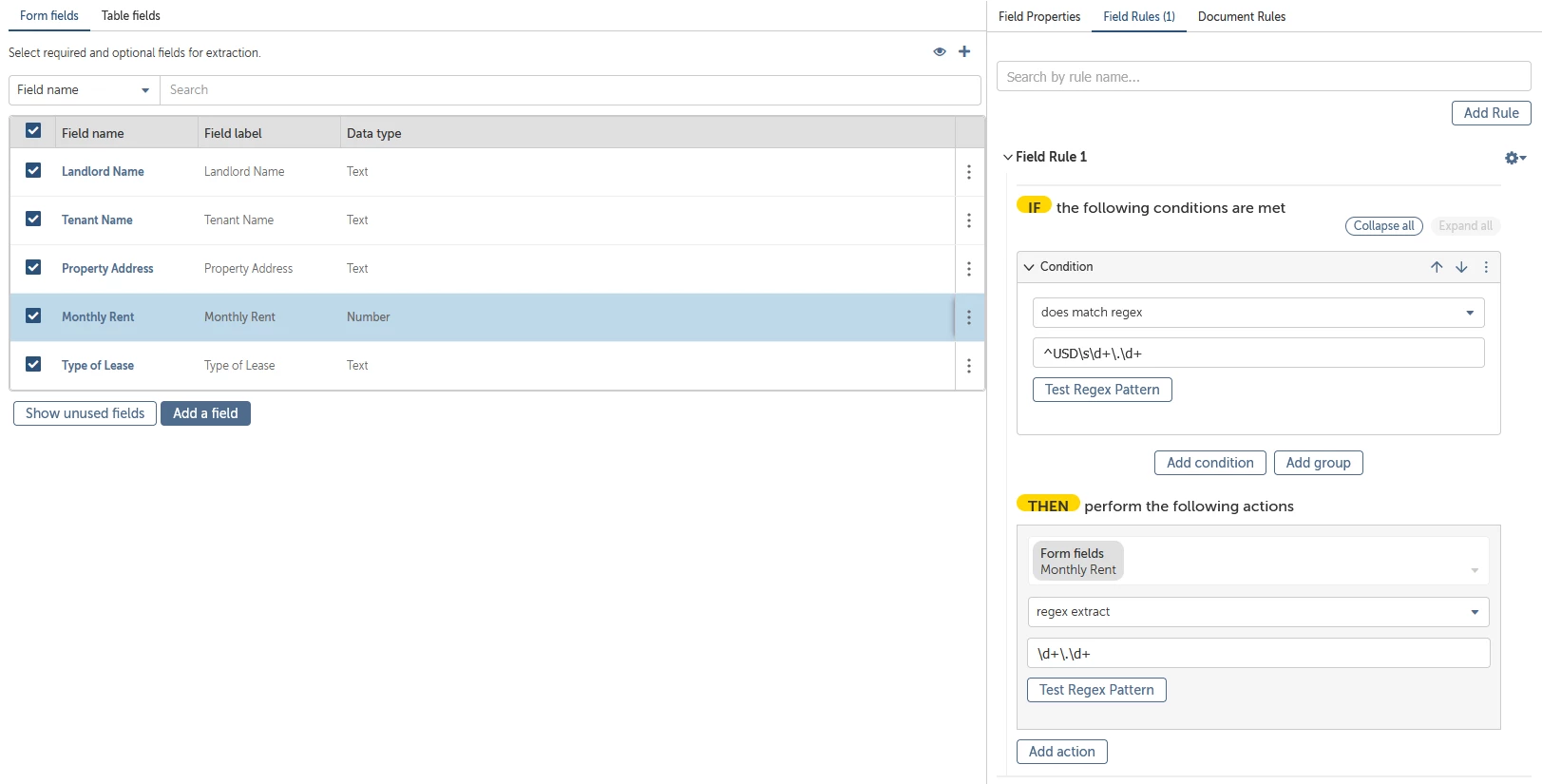 I developed a learning instance where I have an amount field. The value in the PDF document for Amount field is like “USD 495.23”. I would like to extract only the Amount part excluding “USD “ i.e. 495.23. I believe this can be achieved using the regex option in the “Field Rules” but not sure how. Can someone help me here. Thanks in Advance.