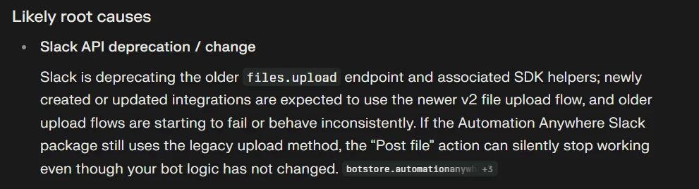 • Workspace/app changes (moving from legacy tokens to granular bot tokens without updating A360 connection).