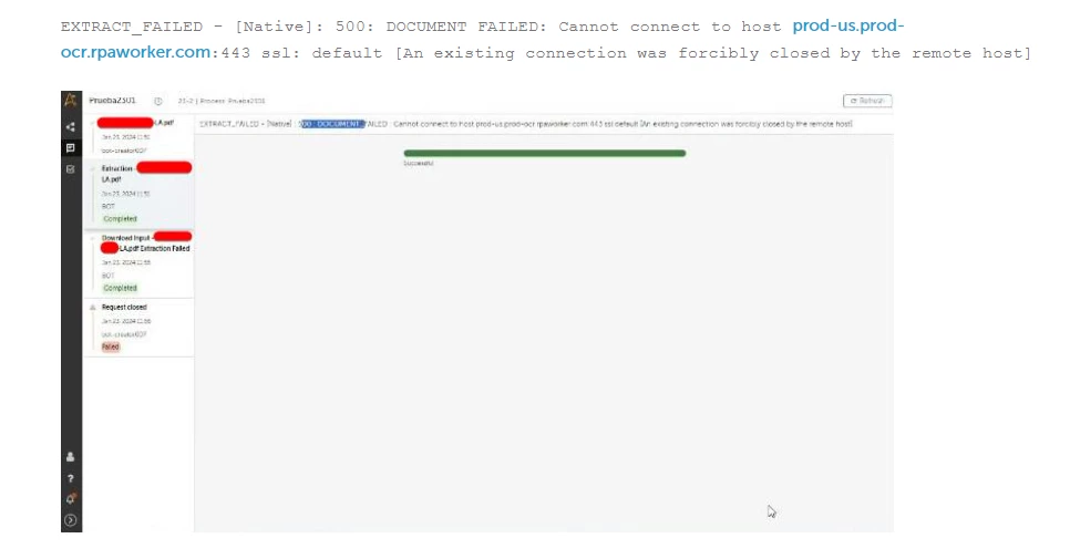 Error Instancia Aprendizaje: EXTRACT_FAILED - [Native] : 500 : DOCUMENT_FAILED : ('Connection aborted.', ConnectionResetError(10054, 'An existing connection was forcibly closed by the remote host', None, 10054, None))