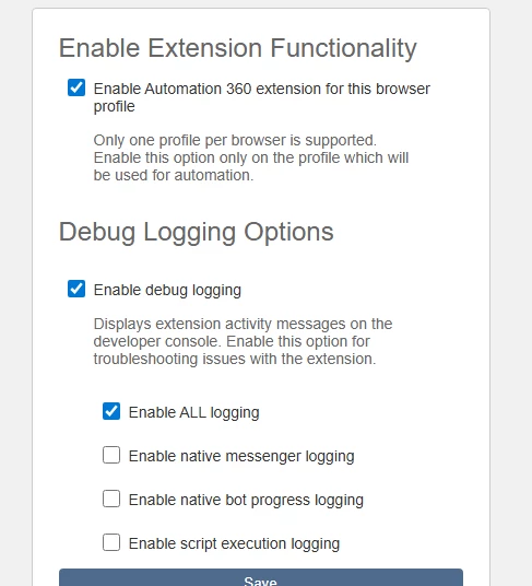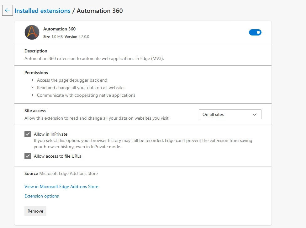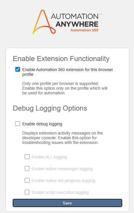 Extension is enabled. When opening a browser msg ‘AA360 Extension is debugging this browser’