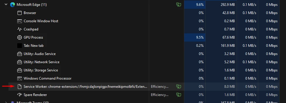• In Task Manager, find Microsoft Edge and expand it. You should see this Service Worker. This is the AA extension.