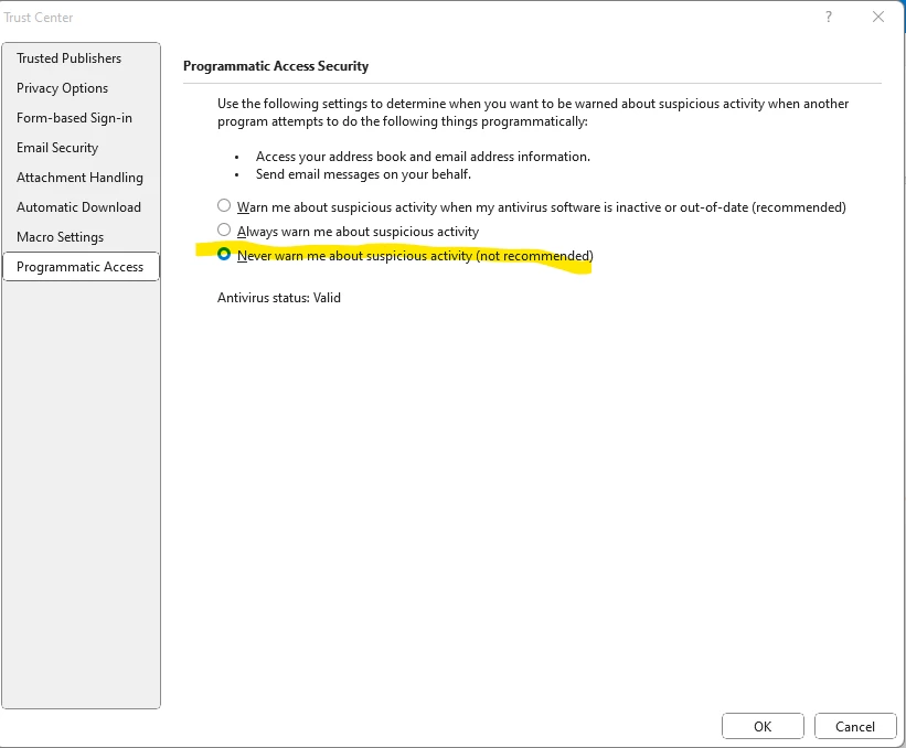 Open Outlook as Administrator --→ Go to File ---→ Options ---→ Trust Center ---→ Trust Center Settings -----→ Programmatic Access