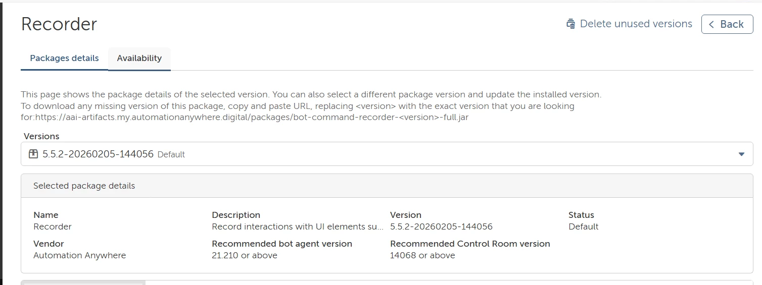 How do I check the package version (ex : Recorder package) in Control Room?