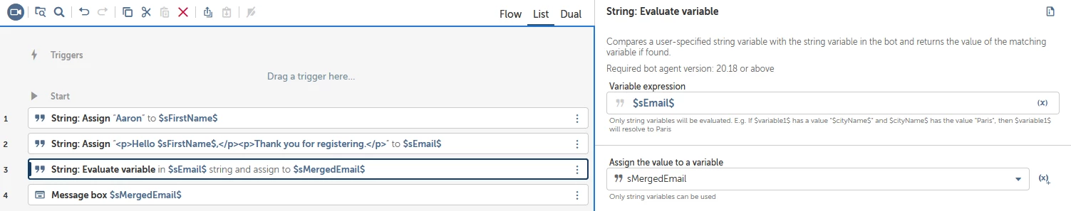 String: Assign - $sEmail$ = "<p>Hello $sFirstName$,</p><p>Thank you for registering.</p>"