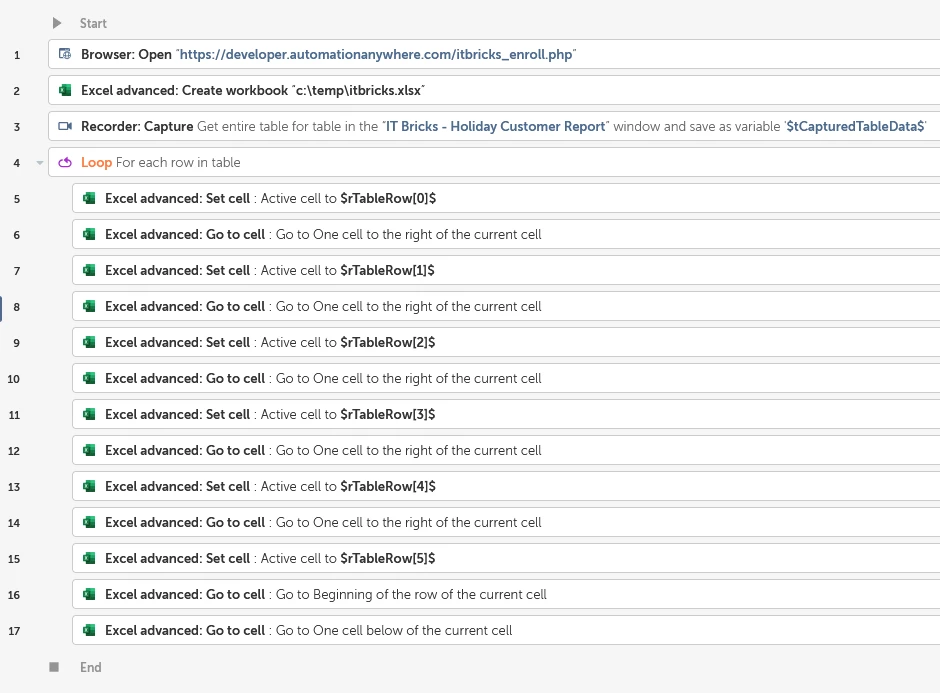 If your end-game is to write data to an Excel file, consider using the Excel *: Set Cell and Excel *: Go To Cell actions instead. This way you can easily visualize and debug your automation because you can watch the cells being written. It’s slower, a bit. It’s many more actions, yes. But it’s worth it when you’re trying to debug an issue.