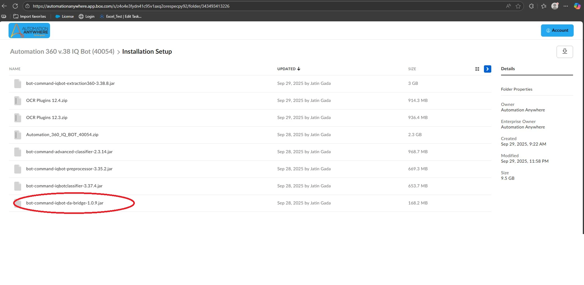 You can download the IQBot-DA Bridge package from the A-People Download portal A-People Downloads page (Login required). To get this package, click a specific Automation 360 IQ Bot version > Installation Setup and download the package.