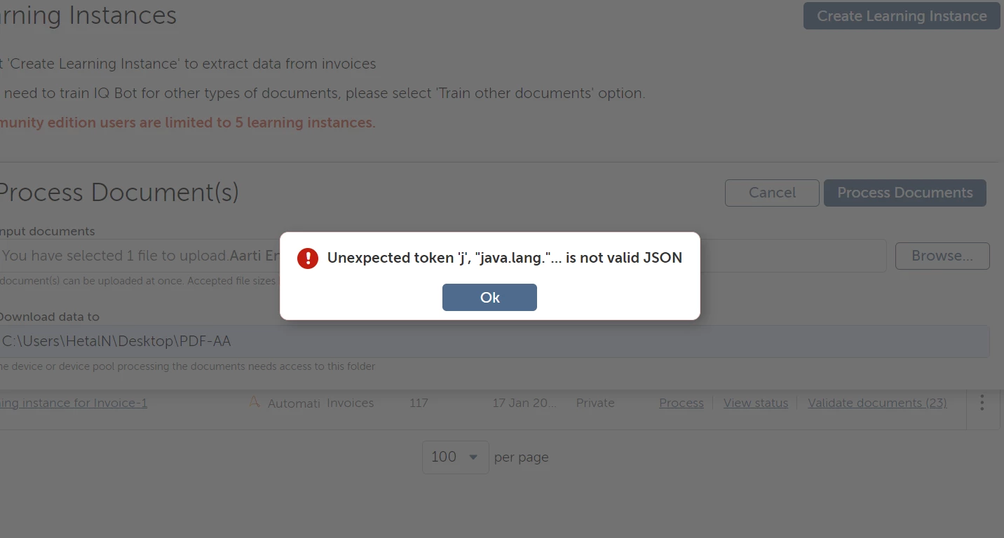 I am trying to process the documents from learning instance and getting error “Unexpected token 'j', "java.lang."... is not valid JSON”