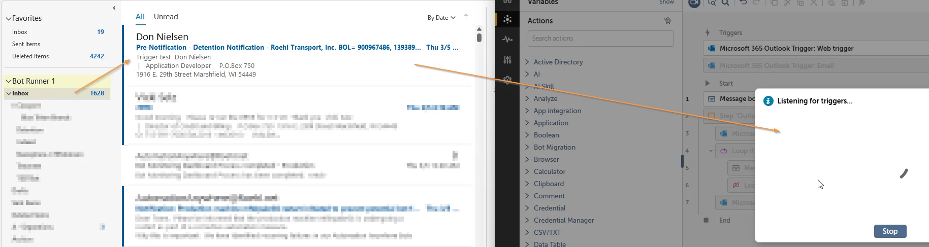After starting the listener, I forward an existing email from my personal inbox to the email account that the bot is monitoring. There is no indication the event was triggered as the bot continues to wait for an event.