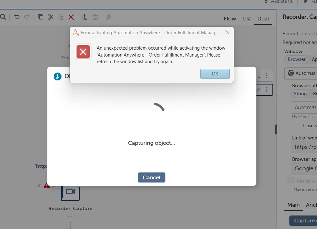 I am using the Automation 360 Community Edition and repeatedly encountering the error message shown in the screenshot when trying to record a desktop application (Automation Anywhere - Order Fulfillment Manager). The error message specifically states: "An unexpected problem occurred while activating the window 'Automation Anywhere Order Fulfillment Manager'. Please refresh the window list and try again."