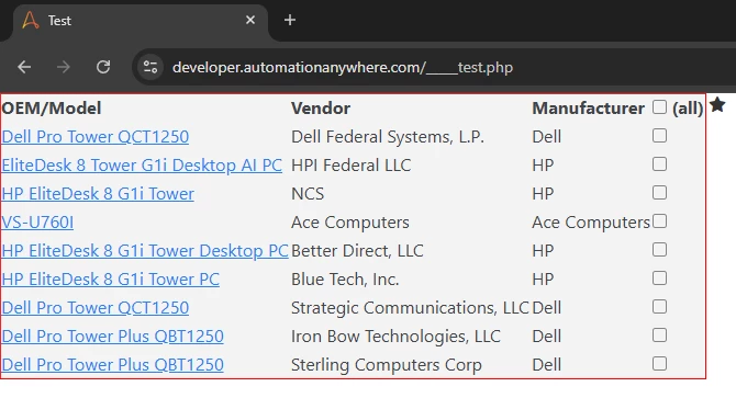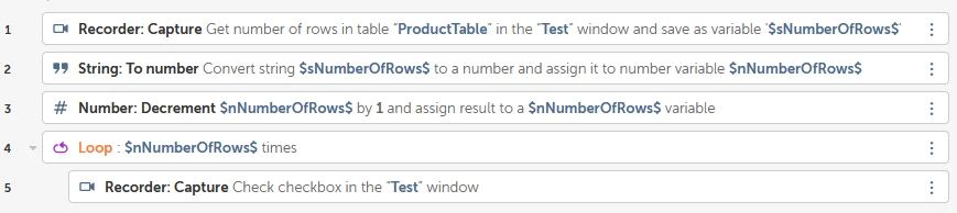 Line 5 is the big one. I captured the first check box, then I had to turn off several properties: HTML ID, Name, Path, HTML Name, and CSS Selector. Finally, I modified the DOMXPath, changing the tr[1] to tr[$nCounter.Number:toString$] to loop through the checkboxes.