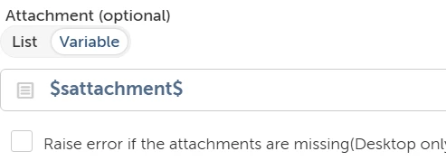 – In Send Email, set Attachment → List → Variable → $sfileattachment$