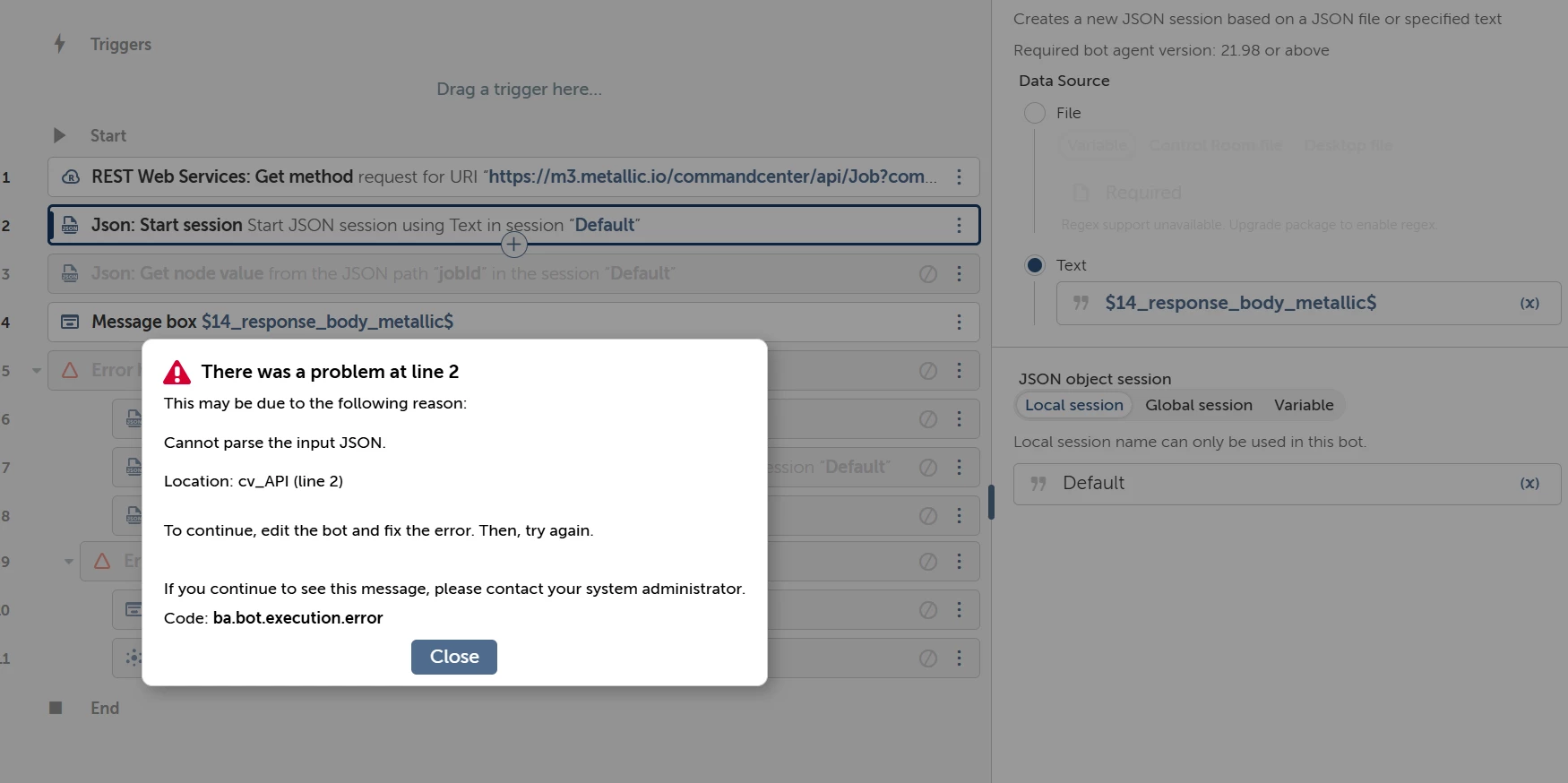 Both the Python script and Postman work fine, but when I run it in the bot, it doesn’t return anything — the message box just comes back empty. And if I send it as a JSON session, it throws an error saying it can’t parse the input JSON.