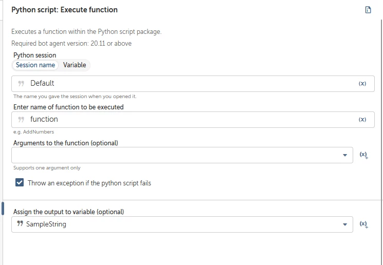I have an Automation Anywhere bot that calls a Python function. The result can only be “bot error” when it fails or “null” when it succeeds.