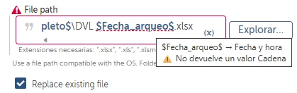 However, when I use Excel Advanced → Save As, the File path field doesn’t seem to recognize my variable.